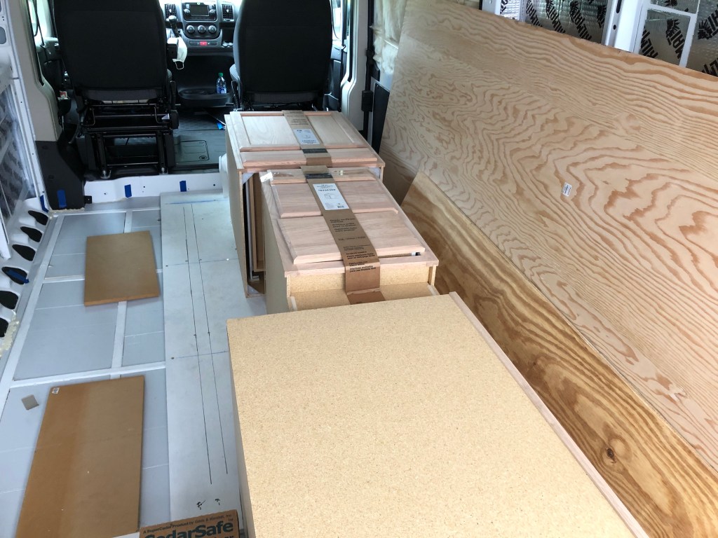 I started on the van by pulling out the thick and heavy vinyl flooring that came from the factory so I could put down sound deadening material and figure out where the sub flooring supports should go. I put the 1×2 “joists” on the raised areas of the floor, allowing me to use a closed cell foam insulation under the plywood sub flooring.