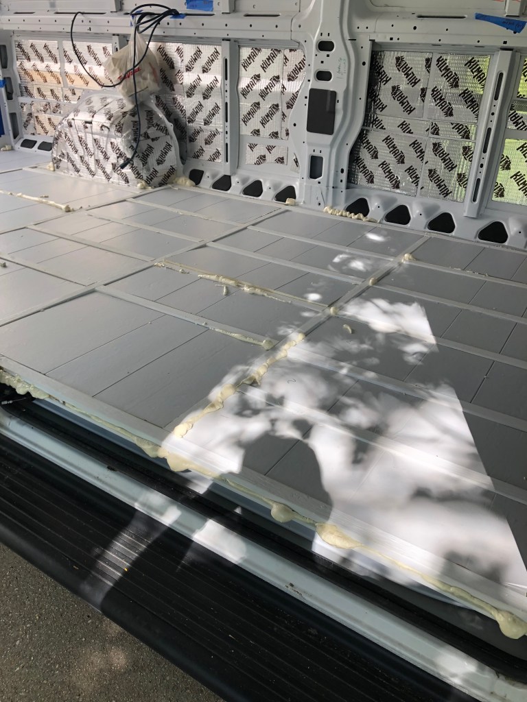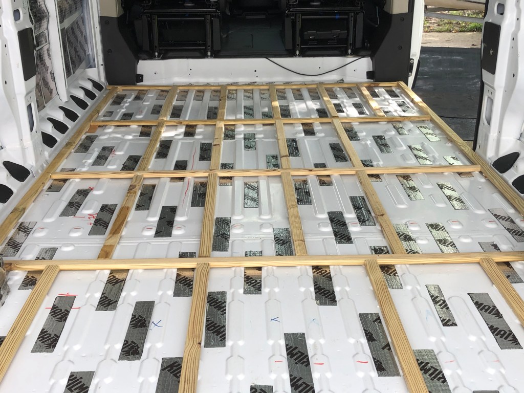 Van sub flooring showing sound deadener and floor “joists”