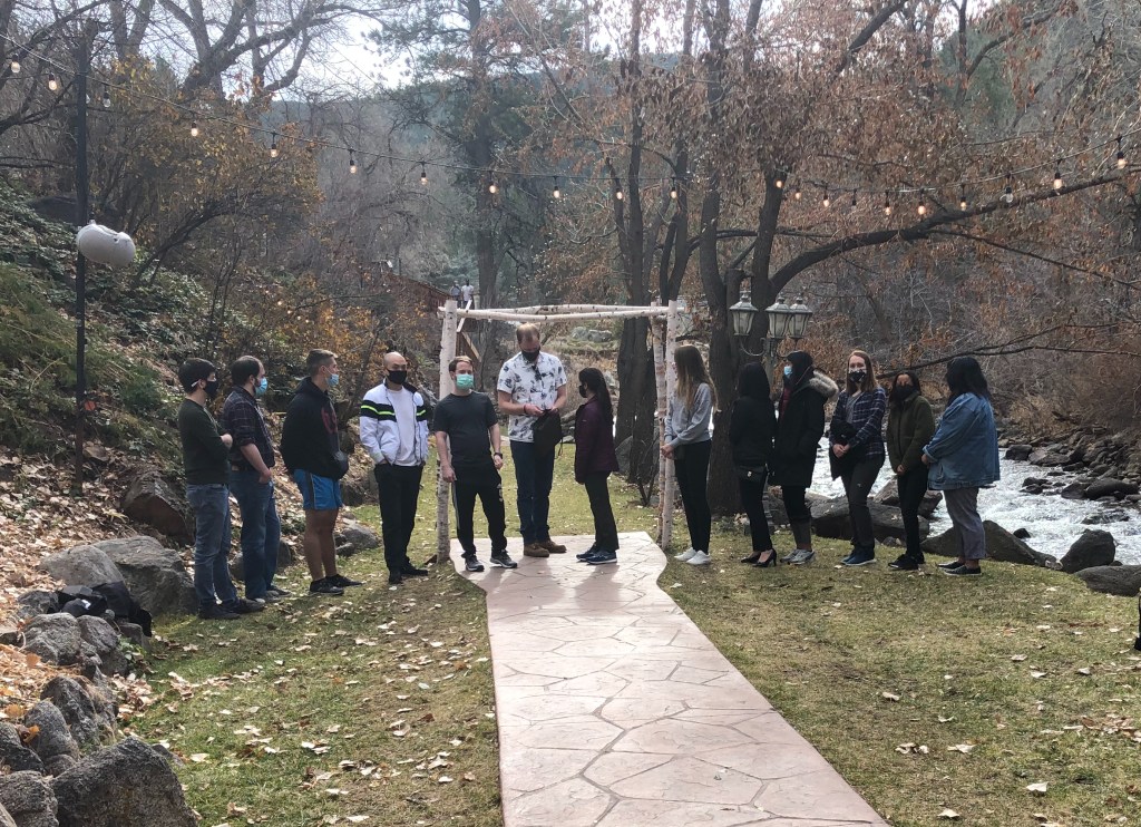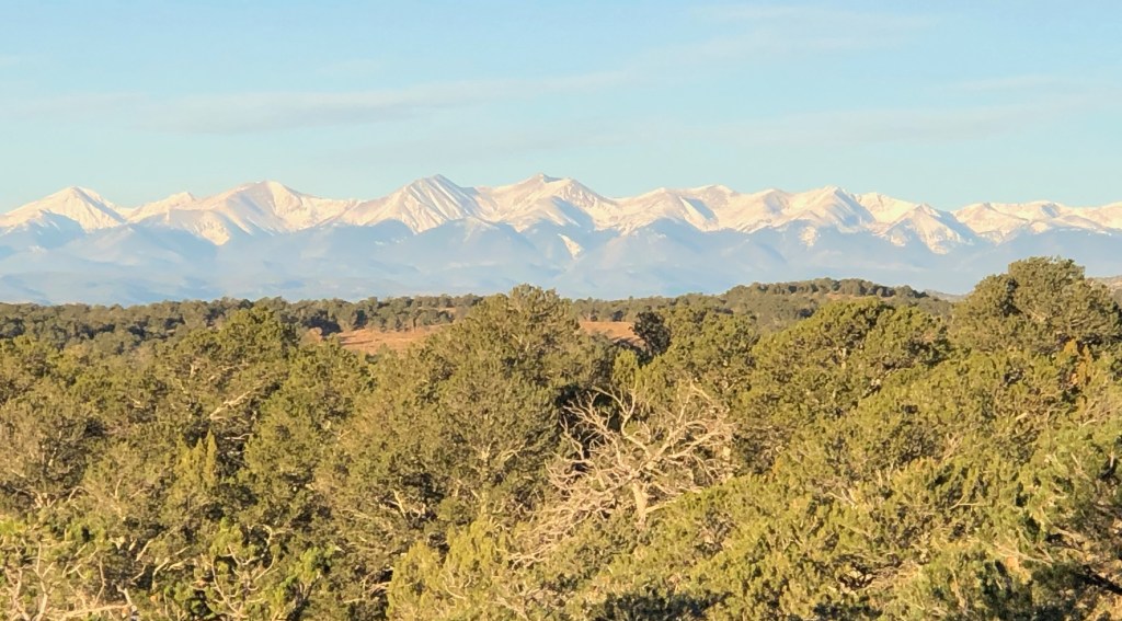 After an overnight stop in Indiana followed by a stop somewhere in the middle of Kansas, we arrived in Colorado the evening before the first wedding event. Time to spare. The van performed flawlessly, and the tossed together interior worked pretty well. The bed was great, the stove and sink worked ok, but the dinette was badly flawed, with no room for more than one of us at a time to have our feet under the table. At least we could eat on it without too much trouble. That was good because as COVID began to close in around us, take-out was often the only source of food. We preferred that anyway; it seemed safer.