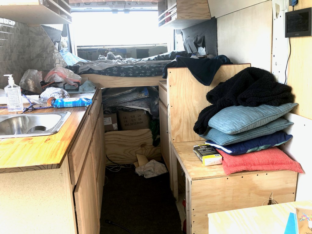 The dinette was designed, assembled, and installed in the last few days before we left. The kitchen area had a functioning two burner propane stove and a sink, but no running water. Water jugs would have to do. None of the cabinets or drawers had latches; bungie cords kept everything from flying open as we drove, if we remembered to hook them up. We had a few overhead cabinets, but no doors on them. Luckily the elevated bed was comfortable and we slept warm. We were well insulated in the walls, ceiling, and floor. The electrical system, while rudimentary, worked well. The solar panels were still in the garage waiting on the roof rack to arrive and be installed, but we had 300 amp hours of batteries that were fully charged and we had some lights. We had thrown together the basic interior design as best we could although nothing was trimmed out or even painted.