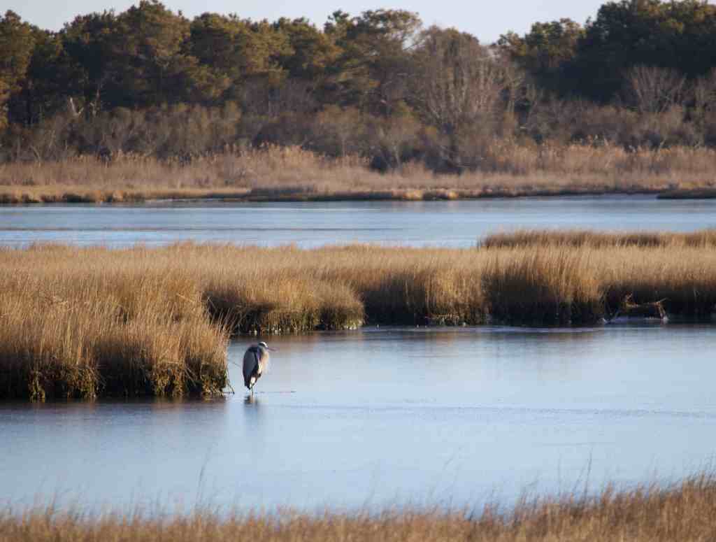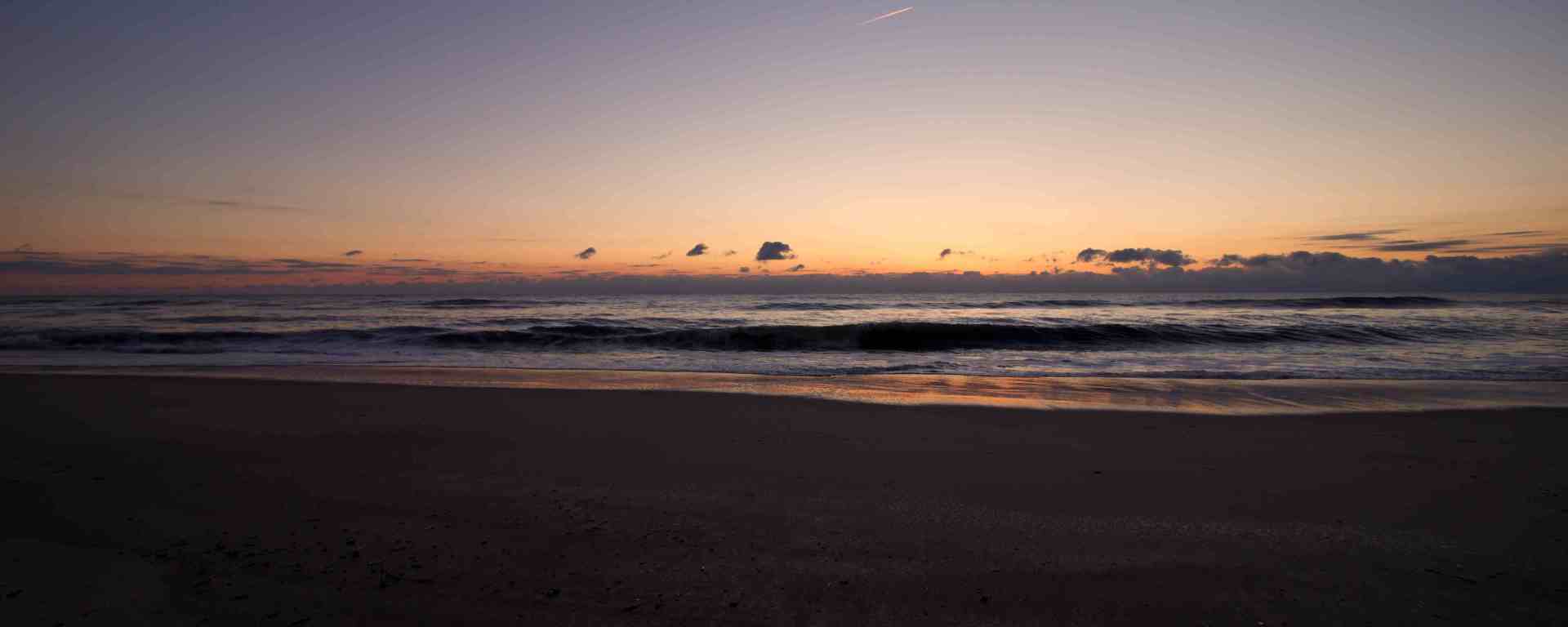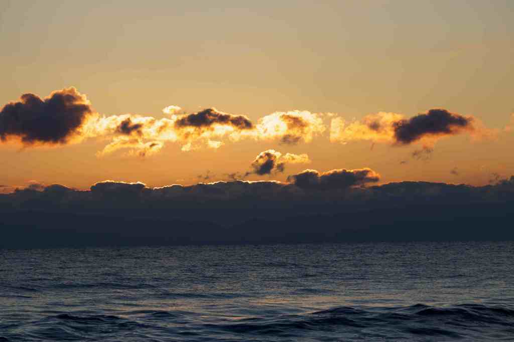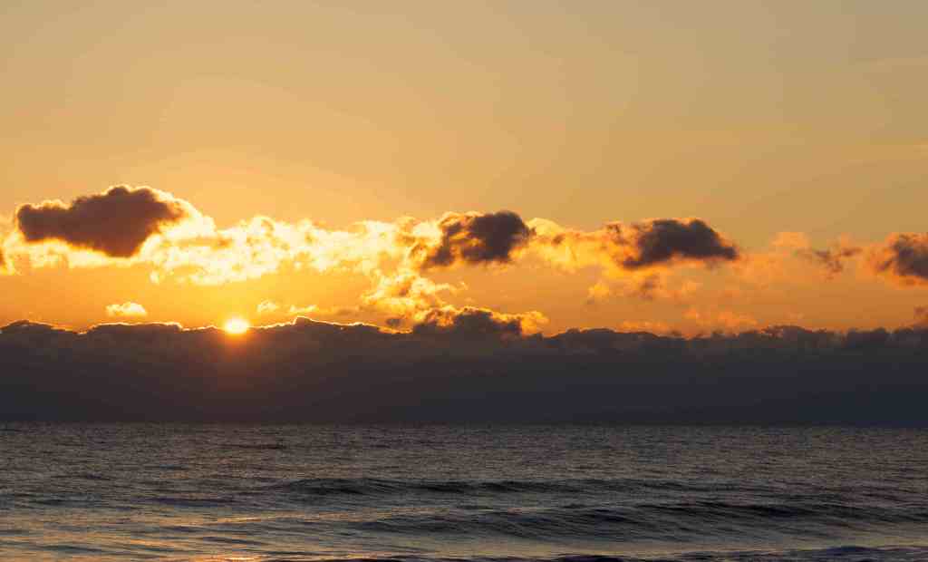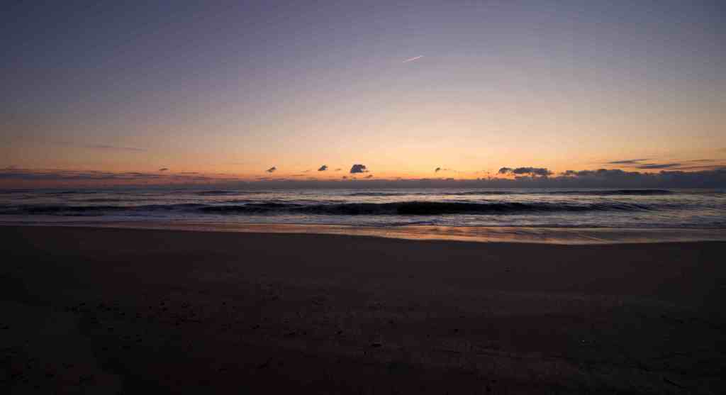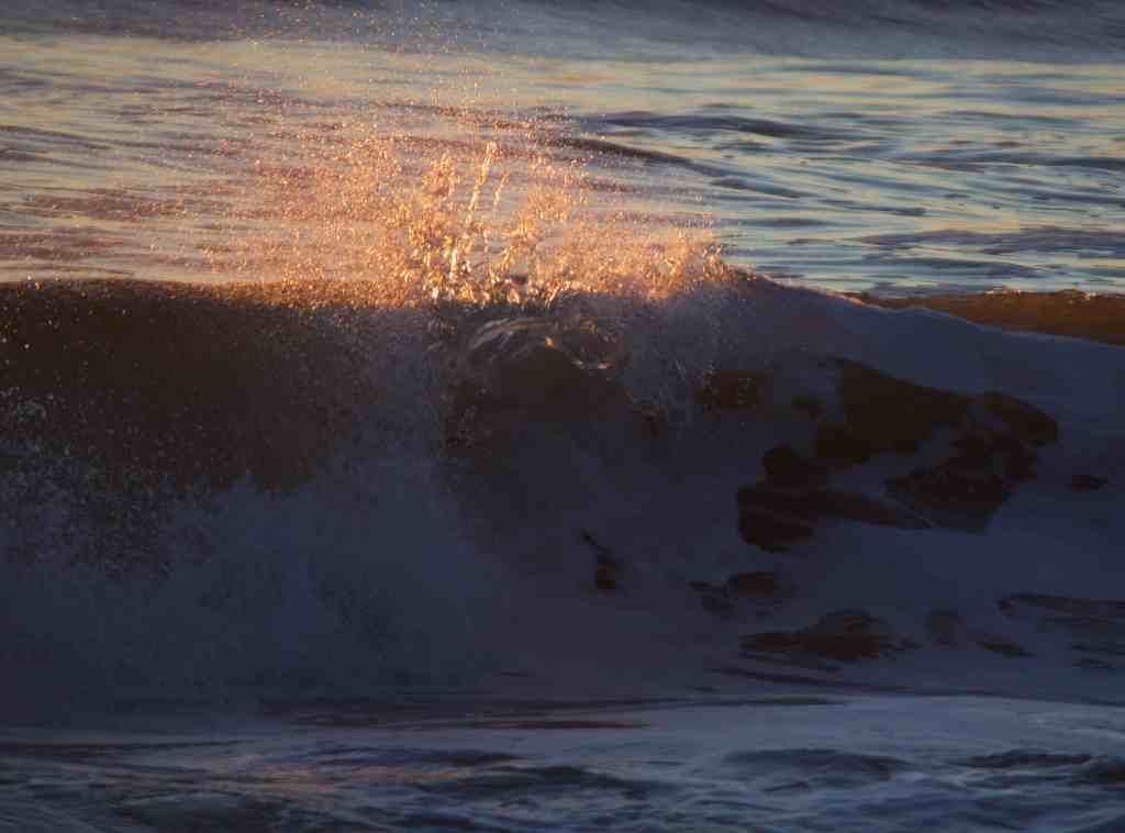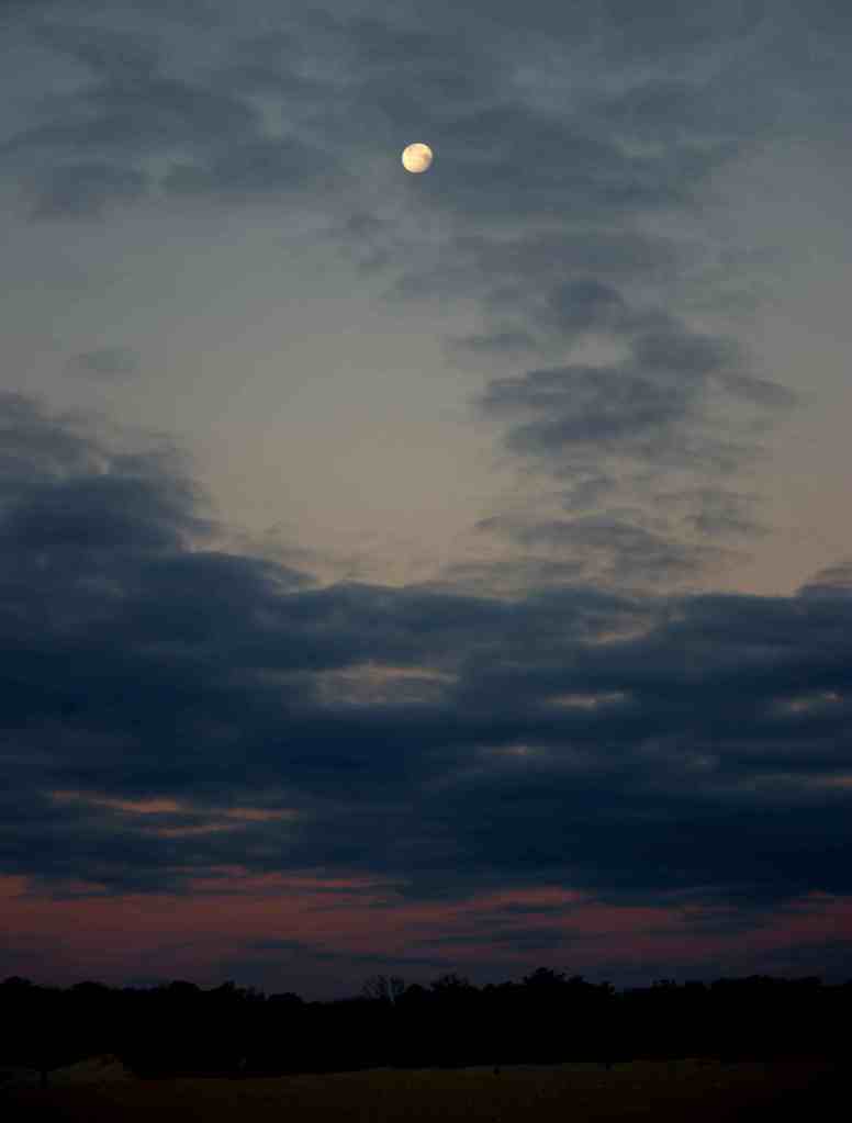 Just the beginning of a sunrise in Assateague Island National SeashoreStill behind the cloud bankIn the meantime, the full moon was still outThe January full moon is called the Wolf Moon. The wolves are howling because they can’t find enough food in the dead of winter.Not to be outdone by the Wolf Moon, the Sun also rises…The low sunlight striking the breaking wavesAs the day wakes, the local fishermen hit the water for breakfast. This is the Sinepuxent Bay inland from Assateague.