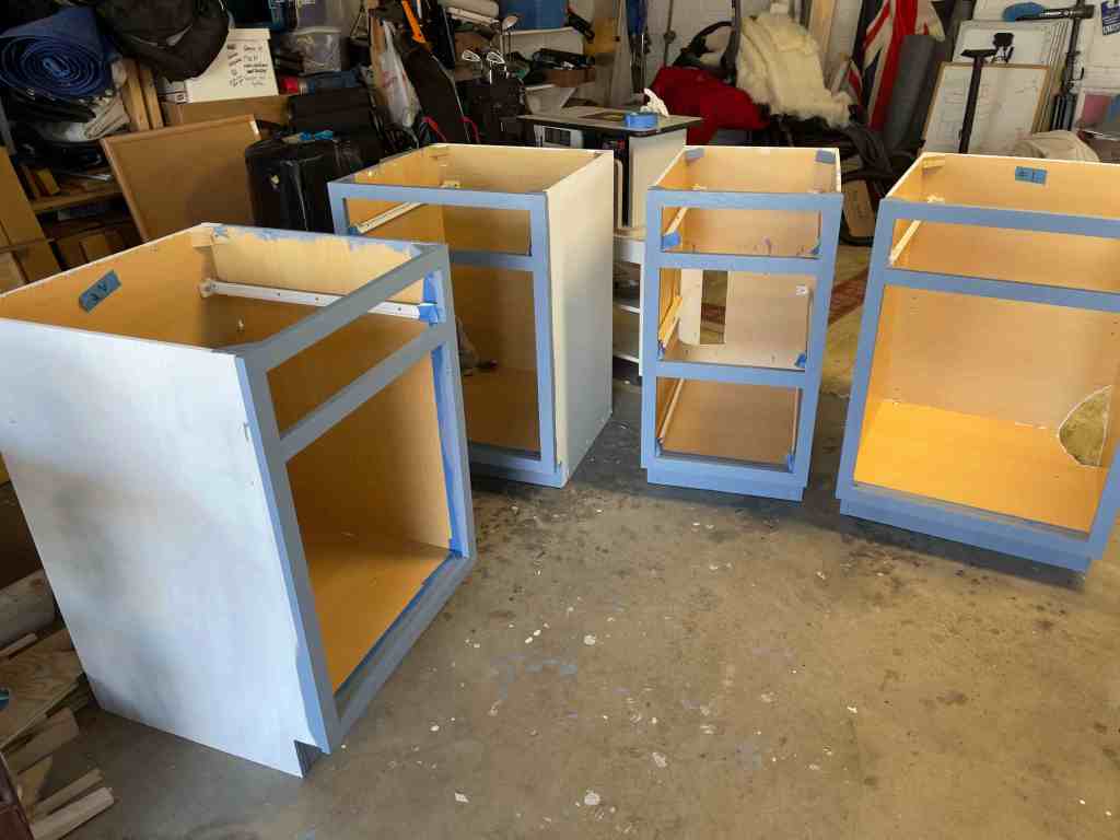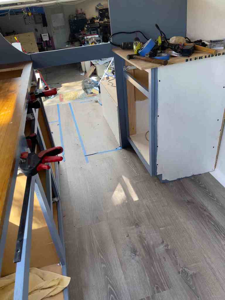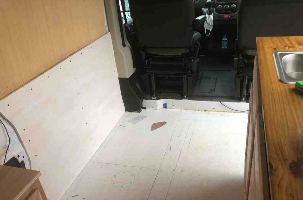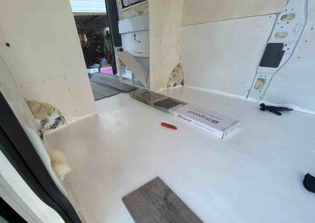 After the trip to Colorado, we had a list of things that needed to be redone in the van. We also had a much longer list of things that needed to be done to fully finish the project. One large thing was to install the final flooring. This required removing everything in the van down to the white sub flooring. It really broke my heart to pull out all the things that I had raced to get put in for the Colorado trip, but I knew it had to be done. The dinette set up was all wrong proportionally. Only one of us could have our feet under the table at a time, and in reality probably only one foot. All of the cabinets needed to be primed and painted, and additional over head cabinets needed to be built, and doors put on all. Lots to do.