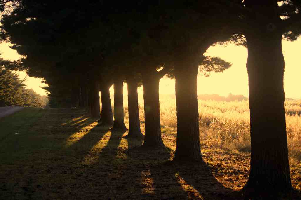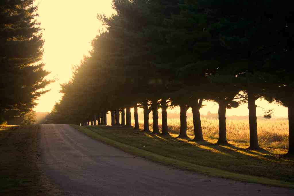 The next morning’s sunrise provided some interesting lighting on a row of trees at the park entrance, so I took a couple of pictures.