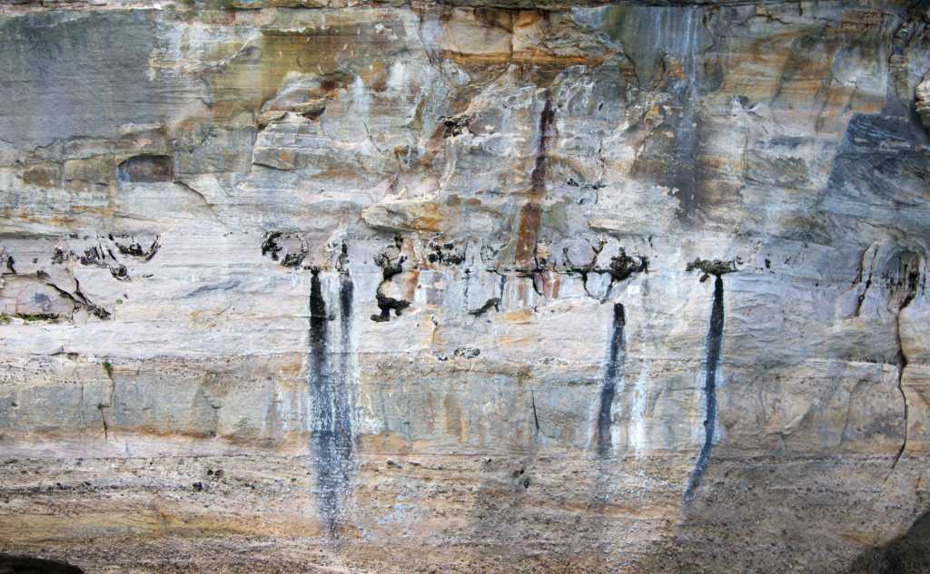 There are many different colors on the rocks, caused by groundwater seeping out of cracks in the rock, carrying minerals along to be deposited on the rocks. Copper causes blue and green stains, red and orange stains are caused by iron. White stains come from limonite, an iron oxide, and the brown and black colors from manganese.