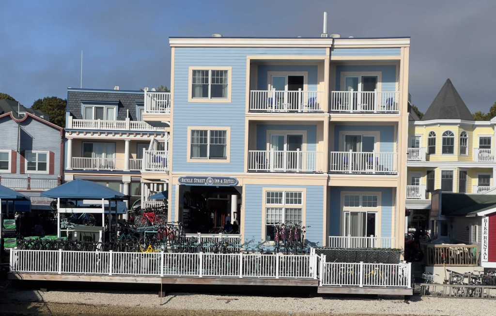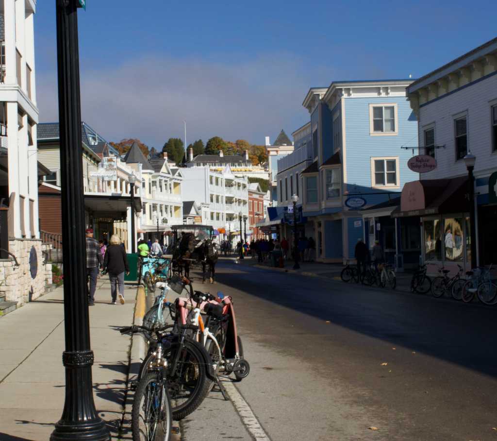 As you approach the dock, you notice several bike rental spots, reminding you that there are no motor vehicles allowed on the island, except for emergency vehicles, service vehicles, and snowmobiles in the winter. Bicycles are everywhere, along with horse-drawn carriages full of tourists.
