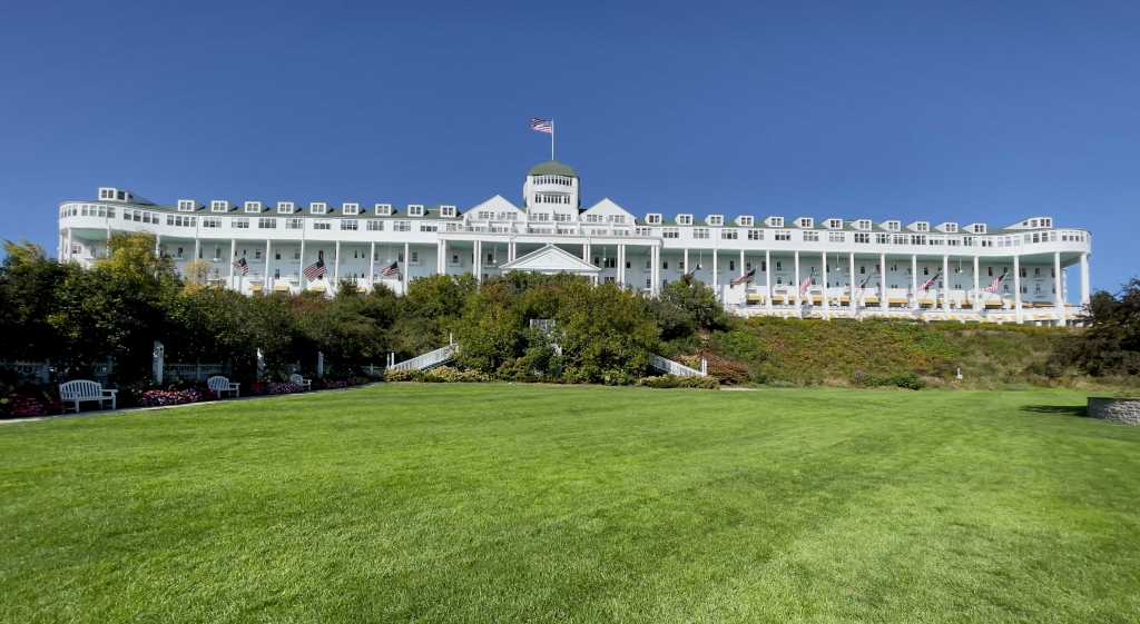 The island is in part dominated by the Grand Hotel, on the hill overlooking the harbor and the city. The massive front porch is the longest in the world at over 660 feet in length, and looks out over the massive swimming pool and the manicured lawns.